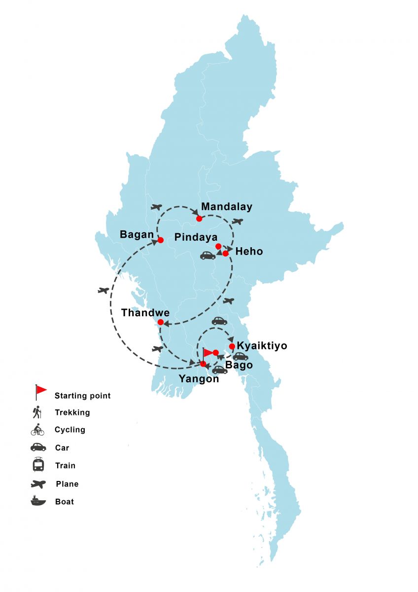 Yangon - Mandalay - Bagan - Inle Lake - Kyaikto - Pindaya - Ngapali beach