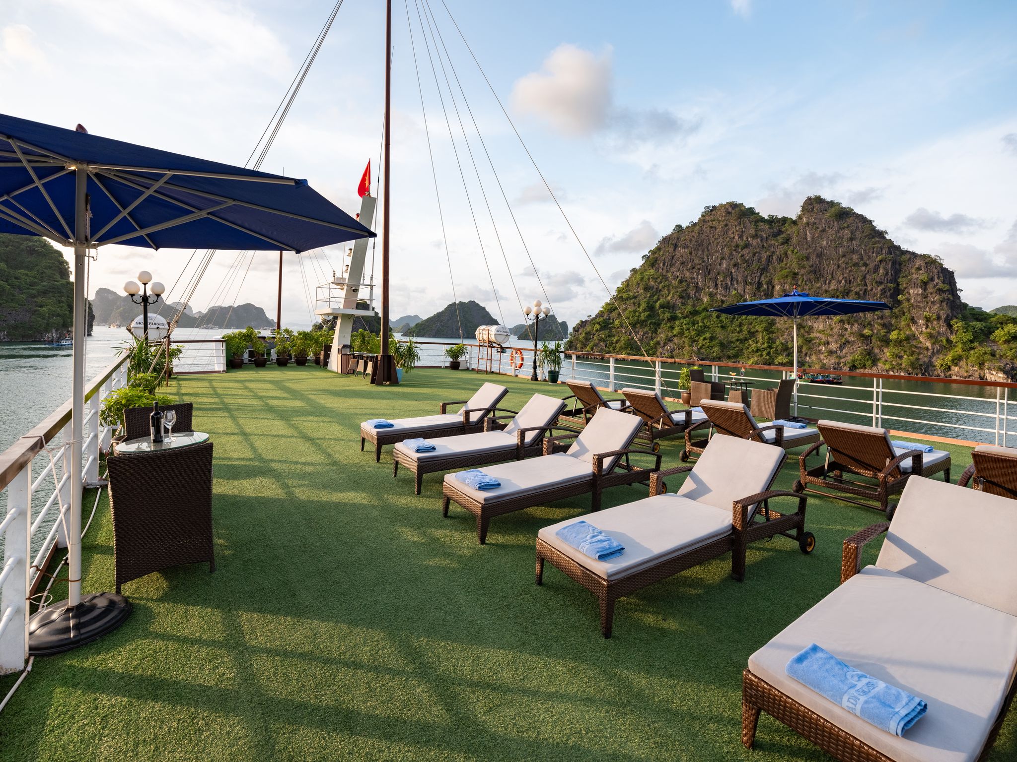 Facilities: Restaurant, bar, spacious sundeck, kayaking service, cooking class, Tai Chi session, squid fishing, and sightseeing activities in Ha Long Bay.