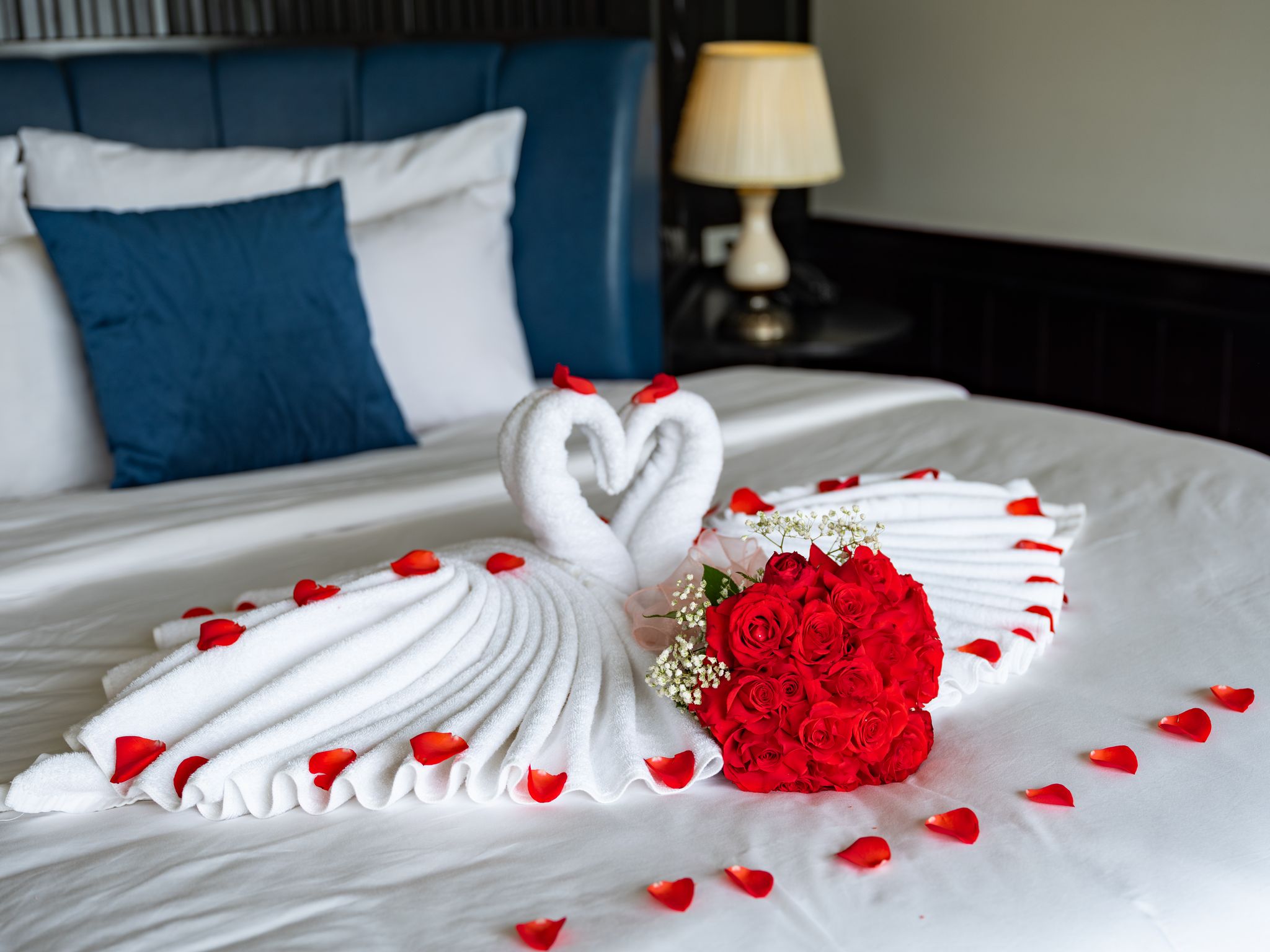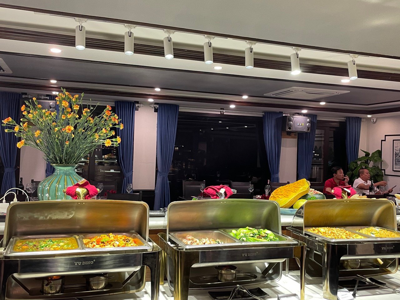 A romantic candlelit dinner served on the Sundeck (depends on weather conditions) featuring gourmet Vietnamese cuisine crafted by the cruise's 5-star chefs. After dinner, you can participate in activities such as watching a traditional Ao Dai performance and Bamboo Dancing.