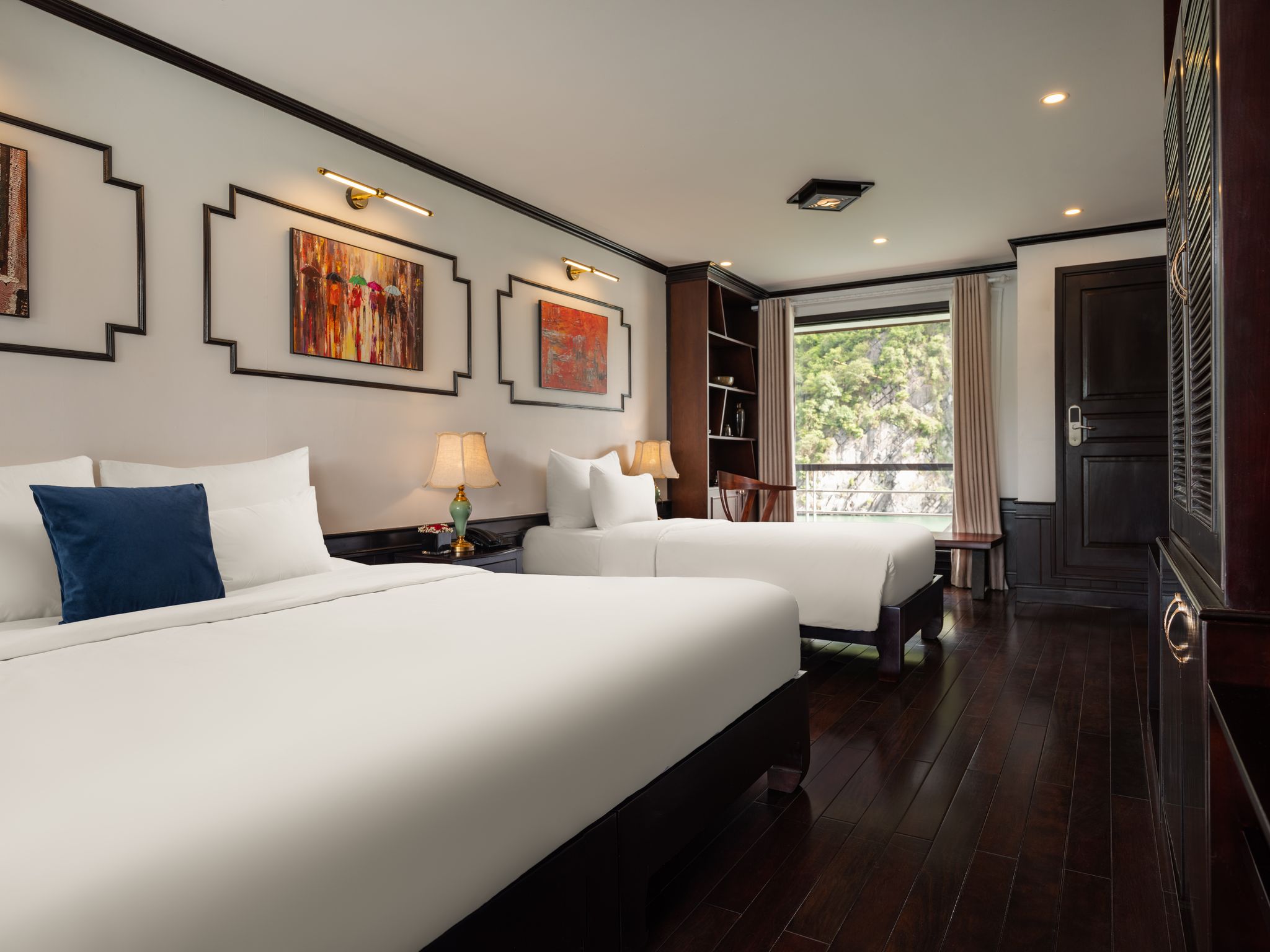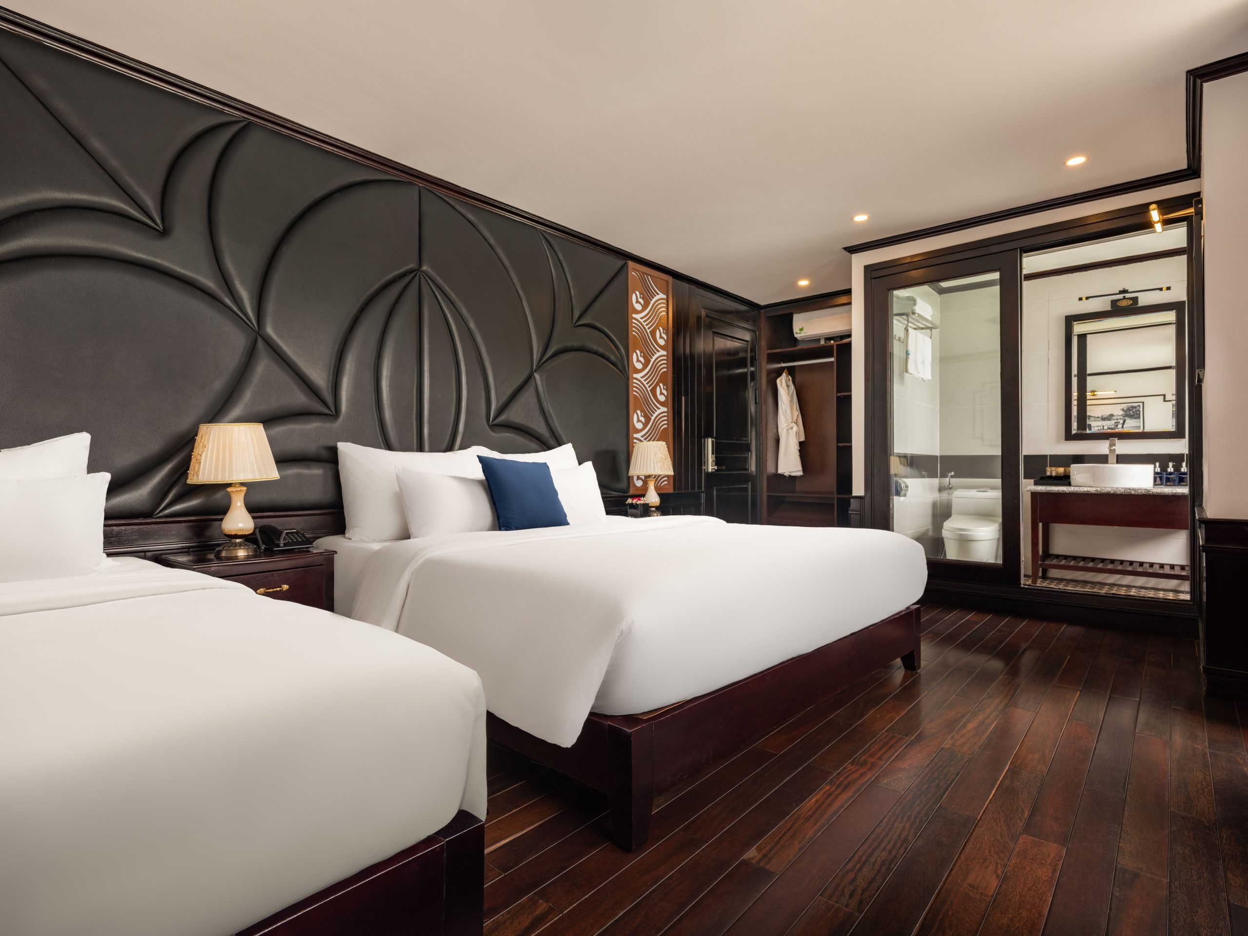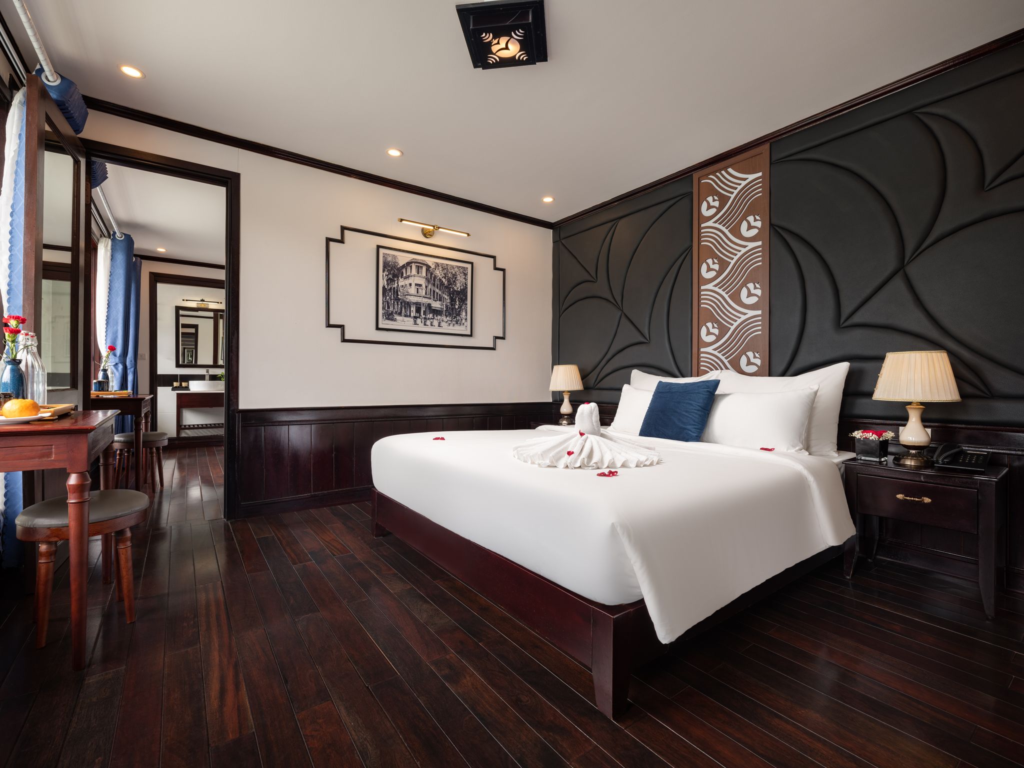 The cruise features an elegant Indochine-style design, combining classic charm with modern comfort. It has 22 spacious cabins, most of which include large windows or private balconies, allowing guests to enjoy panoramic views of the limestone mountains and emerald waters of the bay.