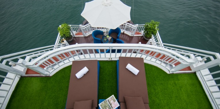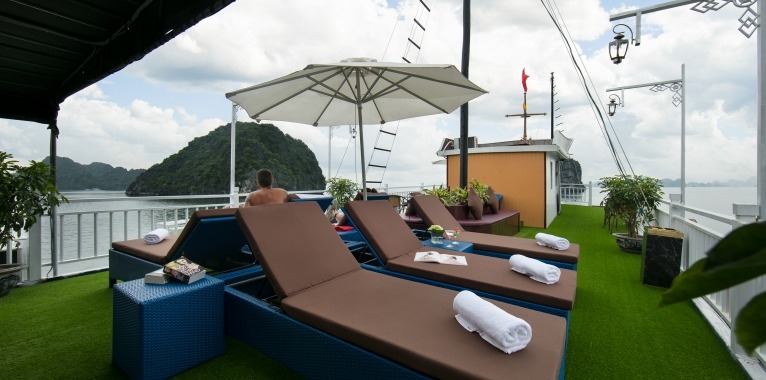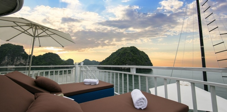 | 15:00 | Kayaking around Pearl Farm Village, visit Titop Island. Free choice of activities such as sunbathing, swimming and conquering the peak of the biggest island in Halong and taking panoramic photos of Halong bay in the afternoon. |