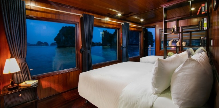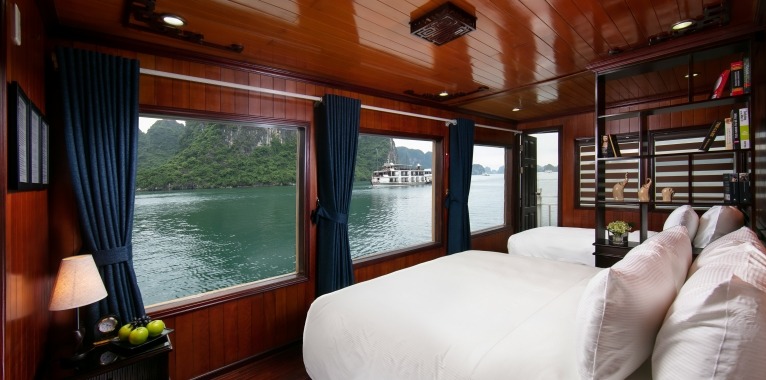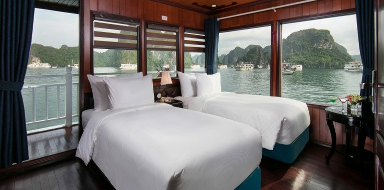 Flamingo cruise has 3 floors with 14 cabins in total, in which there are 8 Deluxe cabins on the 1st floor and 6 other premium & suites cabins on the 2nd floor and its luxury restaurant & bar plus the sun-deck are on the top one. In general, the cruise features spacious, well-appointed cabins and suites with large en-suite bathrooms, large sun-deck with comfortable lounging furniture and elegant dining rooms and bars. We have designed and fitted our boats to international standards while maintaining traditional style, creating the perfect balance of modern comforts and nostalgic ambiance. All cabins are well-organized and sophisticatedly designed by equipping a plenty of modern facilities & technology which look like you are staying at 4-star luxury hotels on land rather than a cruise in the bay.
