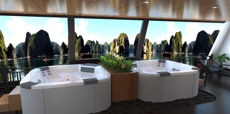 Optional: Sailing boat available for rent as an alternative for kayak (from $10/person and subject to weather condition and availability)18h00Returning LA REGINA LEGEND CRUISE for enjoying magnificent sunset over the Gulf of Tonkin and “Happy Hour” – By 1 Drink get 1 Free. You can choose whether relaxing on the sundeck, sipping a special cocktail with significant recipe of Chief Bartender; or finding your favorite table by the window in Le Magia Café & Restaurant on the third deck. It’s also time for onboard traditional cooking demonstration. Our chef will demonstrate and instruct you some Vietnam dishes recipe. Time for relax in jacuzzi pool on board La Regina Legend Cruise. Two spacious jacuzzi pools are free for guests.