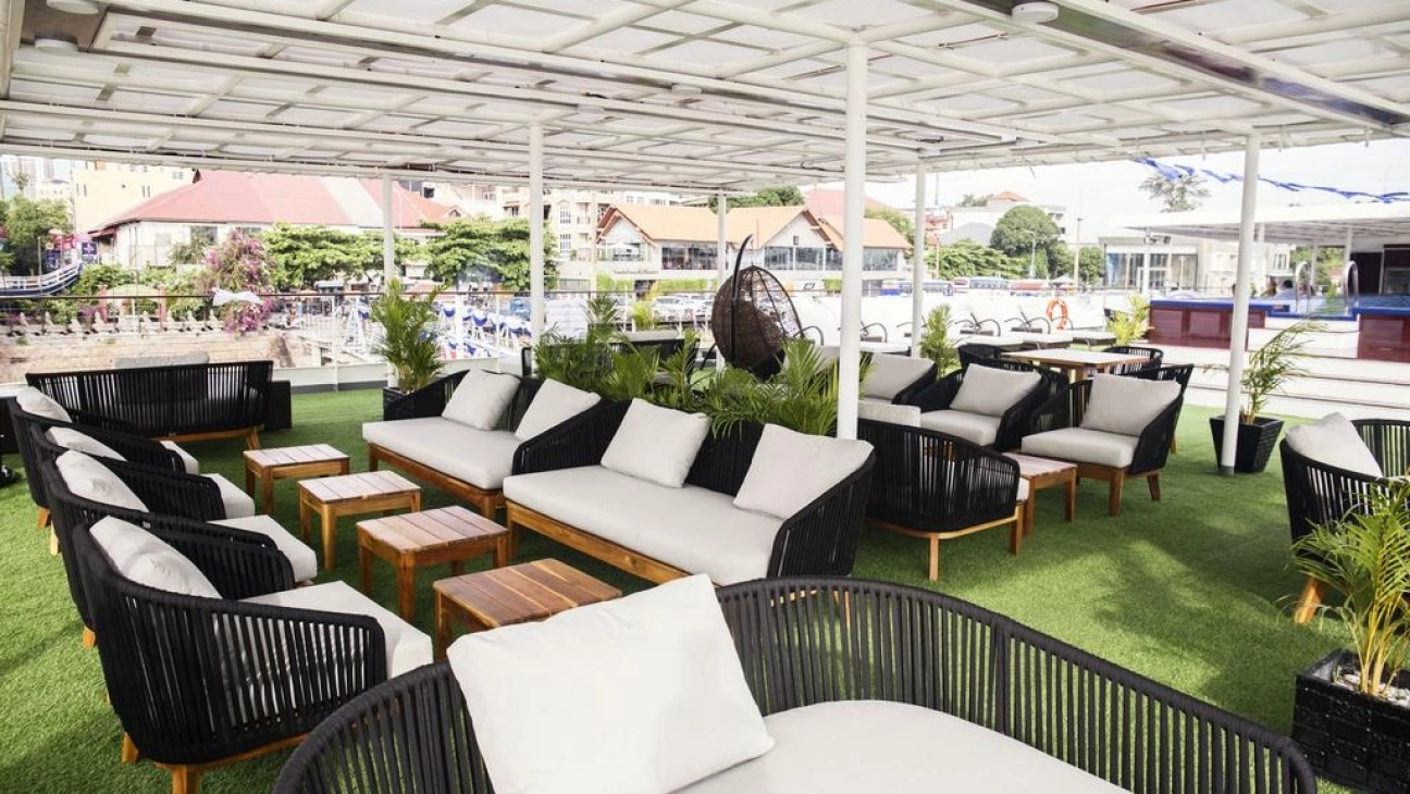 The Indochine measures 65 meters long and 13 meters wide. It has 30 rooms in all (23 m2 ), 8 on the main deck and 22 on the upper deck, each air-conditioned and with a bathroom (3.5m x 1.4m) including toilet, shower and sink. The water on board is taken from the river, passed through a powerful filtration system, U.V / ozone treated and chlorinated in the final step of the treatment.