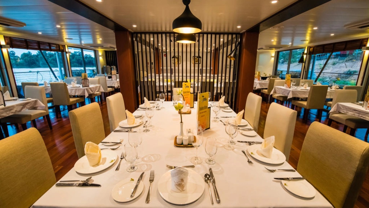 The dining room, with its large panoramic picture windows, is located on the Upper Deck. All meals are served in a single seating. While catering to the Western palate, meals are a combination of Asian and Western cuisine. Local produce and fish provide the freshest of ingredients, and all non-alcoholic beverages are free of charge.
