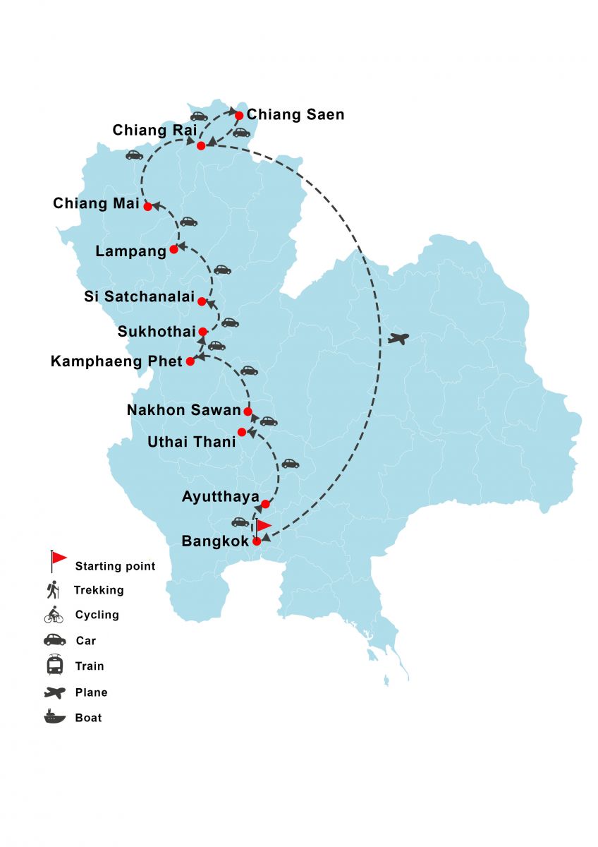 Bangkok - Ayutthaya - Nakhon Phanom - Sukhothai - Lampang - Chiang Mai - Chiang Rai - Uthai Thani - Chiang Saen