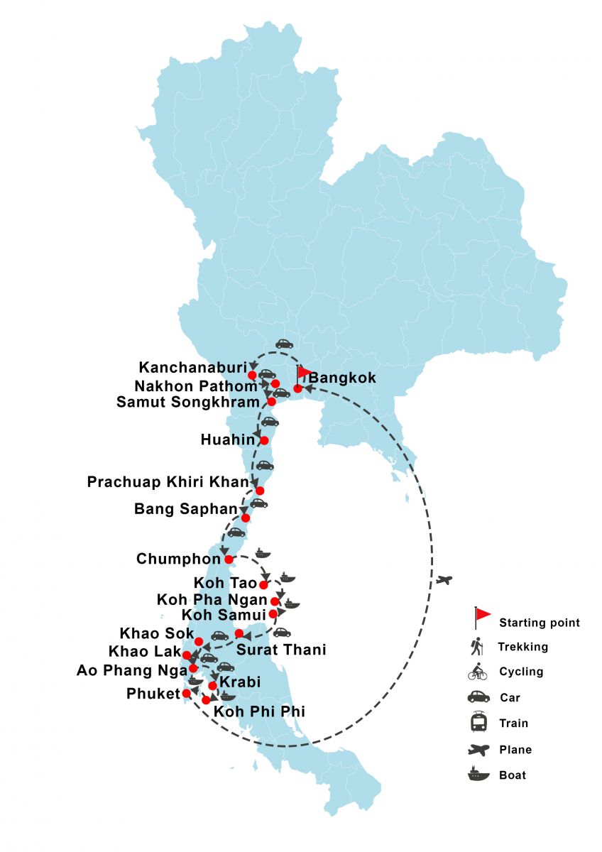 Bangkok - Kanchanaburi - Nakhon Phanom - Hua Hin - Koh Tao - Koh Phangan - Koh Samui - Surat Thani - Khao Sok - Krabi - Koh Phi Phi - Bang Saphan - Samut Songkram - Khao Lak - Phuket