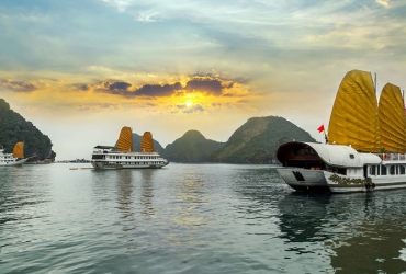Breakfast at hotel and then start a 3-hour drive through the Red River Delta to Ha Long City. Comfort stop en route for photos and coffee before arriving to Ha Long City. We then transfer to a luxury wooden sailing junk for a cruise through the limestone cliffs and emerald waters of Ha Long Bay, giving us the chance to take in the stunning scenery of this World Heritage Site. While on board we will be served a sumptuous fresh, local seafood lunch followed by a swim and exploring some of the limestone caves in this area. When the sun comes down we drop anchor for the night nearby a remote island.  Dinner on board. Overnight on Junk