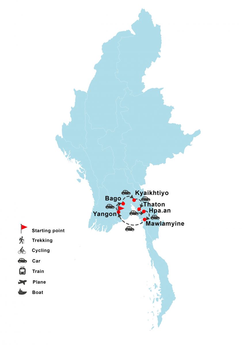 Yangon - Bago - Kyaikto - Thaton - Hpa An - Mawlamyine