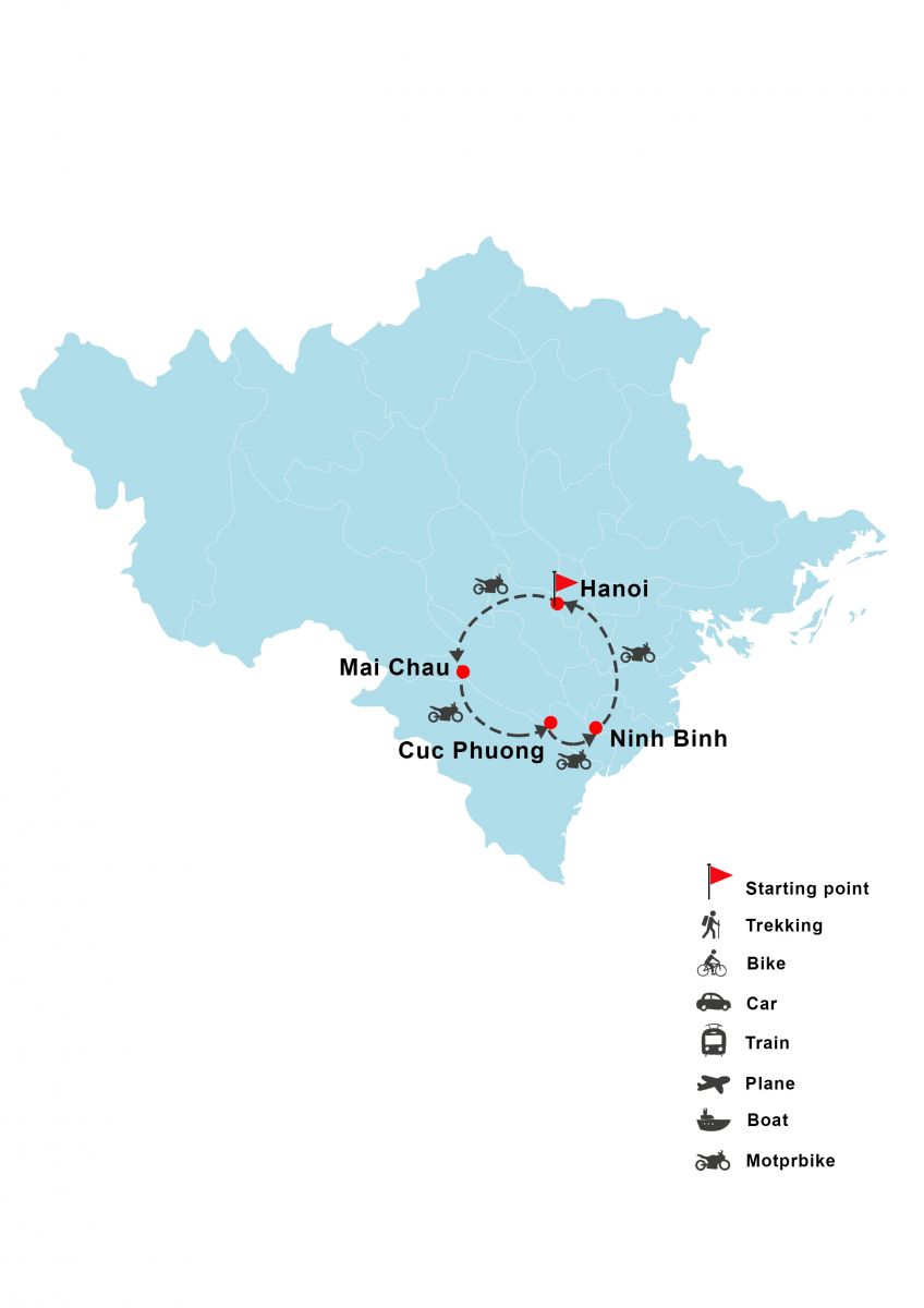 4 days trip to Mai Chau and Cuc Phuong trip is really a short trip however you will get a lots of experiences in the areas off the beaten track, get away from the noisy city. Start your trip from Hanoi city, you will ride uphill to Hoa Binh and to Mai Chau It’s surrounded by a green valley and stilt houses. Many minorities, including the Thai ethnic group live here. After very interesting night stay in house on stilt, eat the foods prepared by the family, you will continue your riding trip to Cuc Phu national park in Ninh Binh, it’s one of Vietnam’s most beautiful and important protected area. You will have great experience when you stay in the guest house of the park, very calm and quite night. You then have time to do some trek through the forest to get chance to see rare animals. After that riding to Ninh Binh to visit the ancient capital of Vietnam and take the exciting boat trip in Tam Coc where you will feel the scenery similare to Halong Bay.