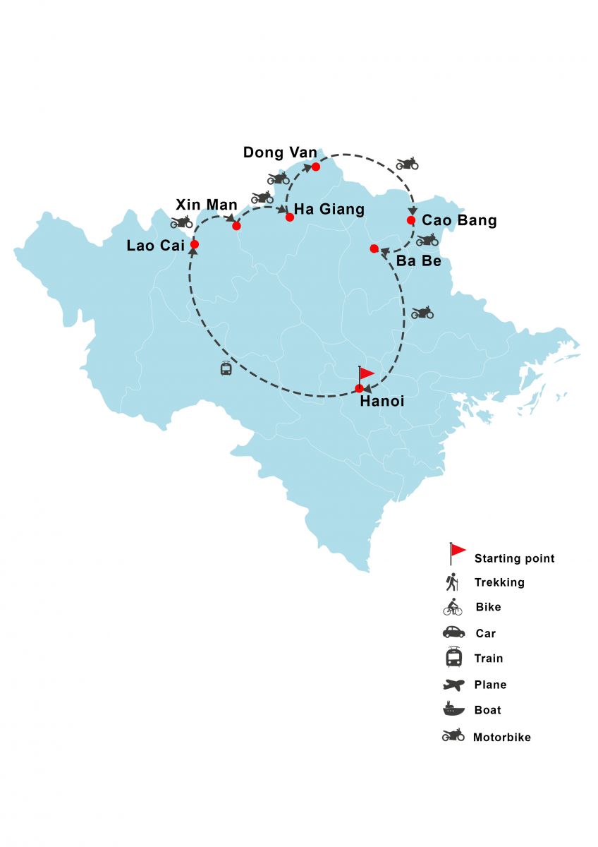 Cross mountain to access the most beautiful traditional market in Bac Ha, a relaxing base to explore northern highlands and 11 hill-tribe villages living in and around there. Visit the old Palace of King H’Mong before having lunch then continue to Xinman to stay in a little peaceful guesthouse. From Xinman, we expect a full day of challenging mountainous climbs to reach Ha Giang. One of the best parts of this trip is the ride from Ha Giang to Dong Van, admiring not only a beautiful view of the mountains but also an imposing view of the rock plateau that won’t disappoint any motorcyclists. Arrival in Dong Van, walk around the town to see colorful markets or visit some interesting ancient houses which are more than 200 years old. Move on to Pi Leng pass – one of the longest and most beautiful passes in North East of Vietnam, the sheer scale of it all will definitely amaze you. Explore the villages of the Nung people who still make incense, paper, farming implement without modern machines then ride straight up to the Northern border between Vietnam and China to see the most beautiful waterfall in Vietnam – Ban Gioc. It is one of Viet Nam’s best-known waterfalls, fed by the Quay Son River that marks the border with China. Continue to Nguom Ngao, such a famous limestone grotto in the northern mountain province of Cao Bang because of its distinctiveness and scale. Go for a boat trip on the Ba Be lake – one of the biggest natural lake in Vietnam. Lastly, stop at Thai Nguyen tea plantation and ride on a winding dike road along Red river, getting back to Hanoi.